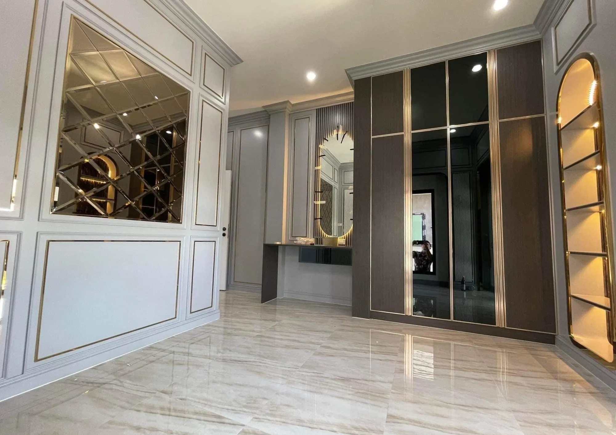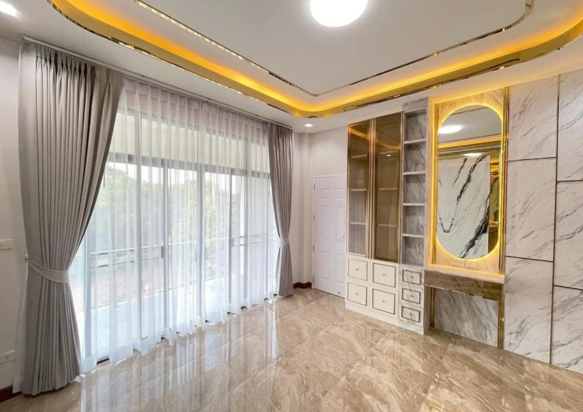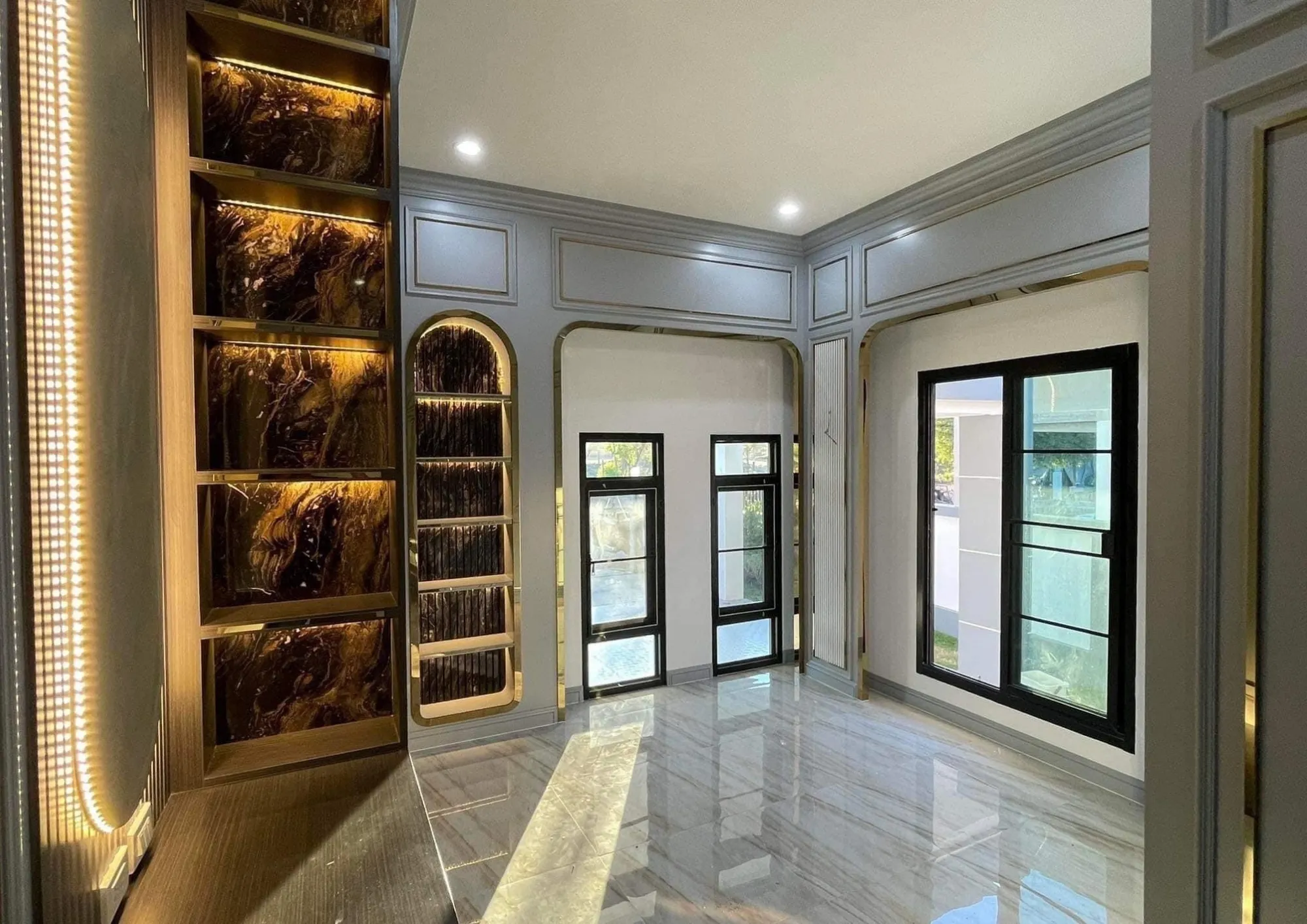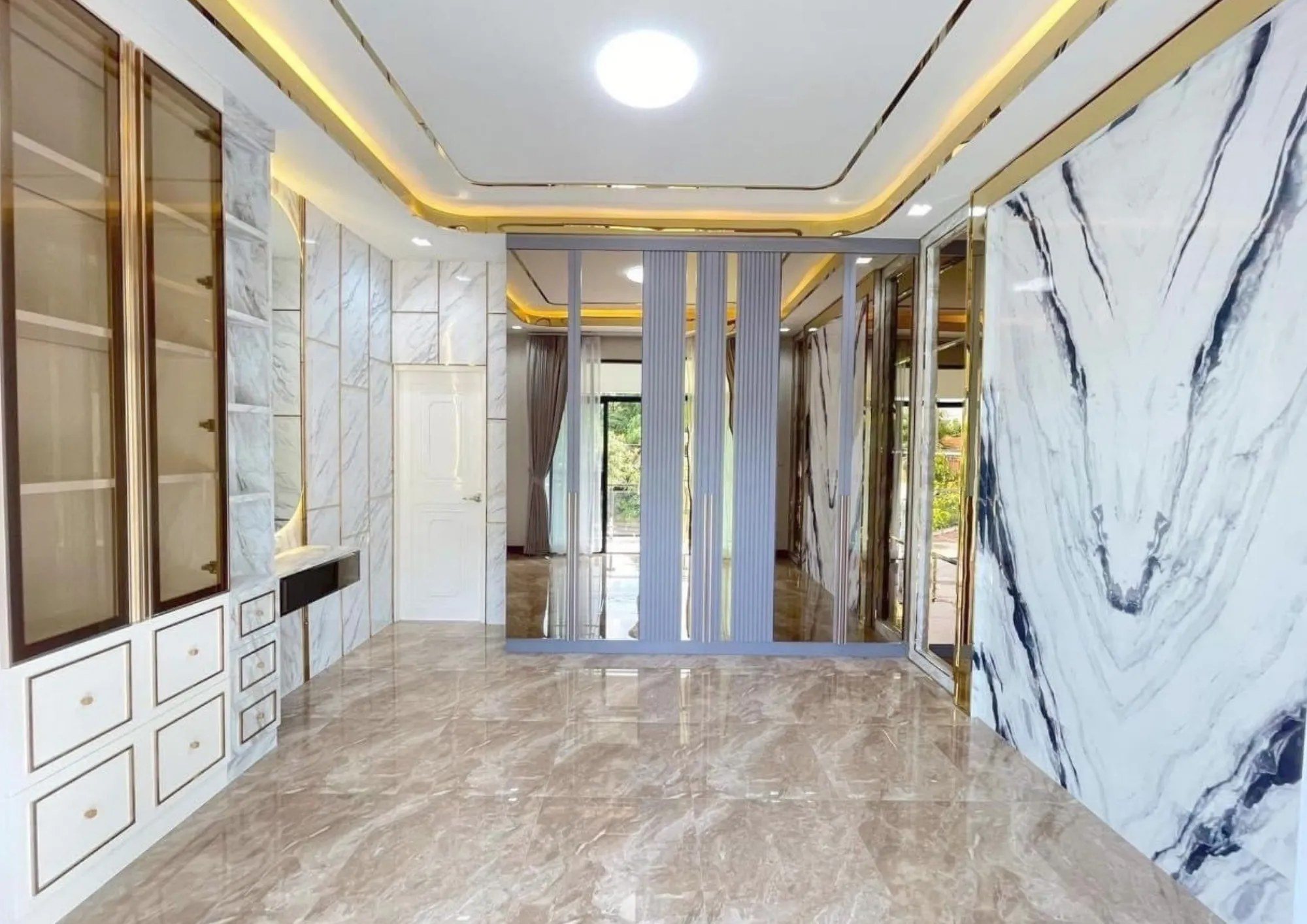 • เฟอร์นิเจอร์บิวอินขอบทองที่รับกับพื้นกระเบื้องแกรนิตโต้ผิวมัน