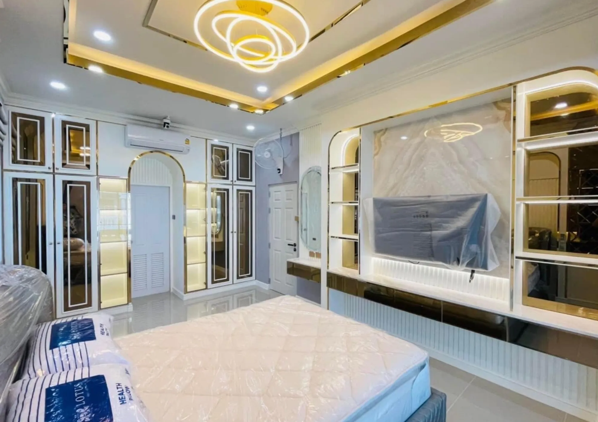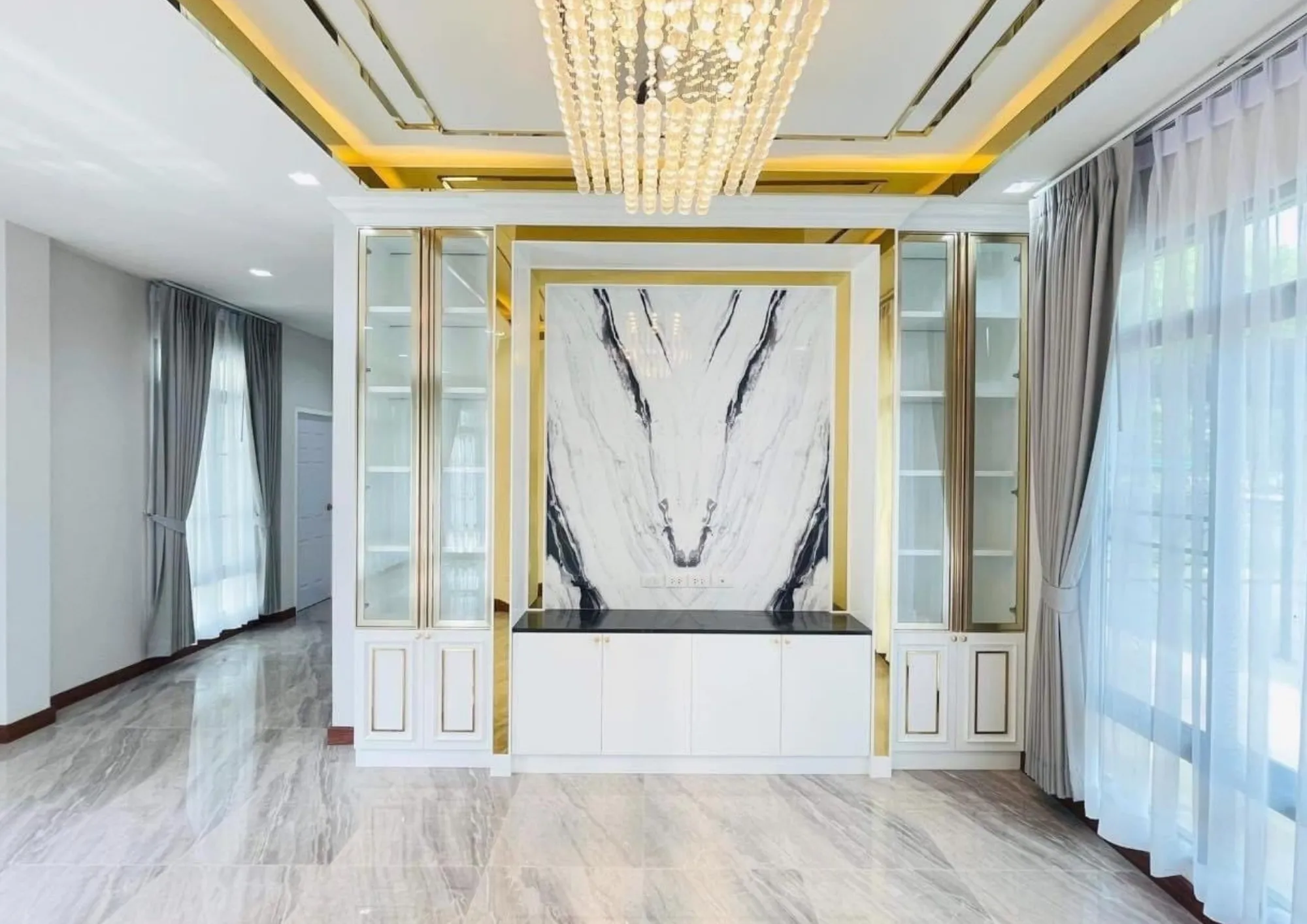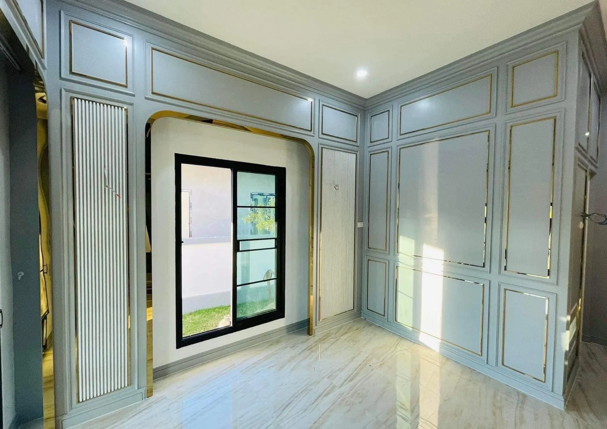 • เฟอร์นิเจอร์บิวอินขอบทองที่รับกับพื้นกระเบื้องแกรนิตโต้ผิวมัน