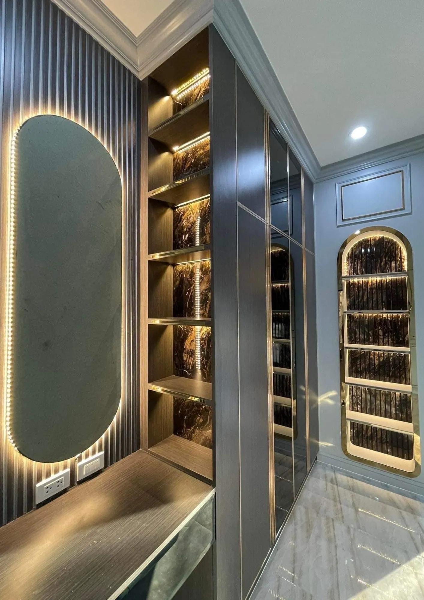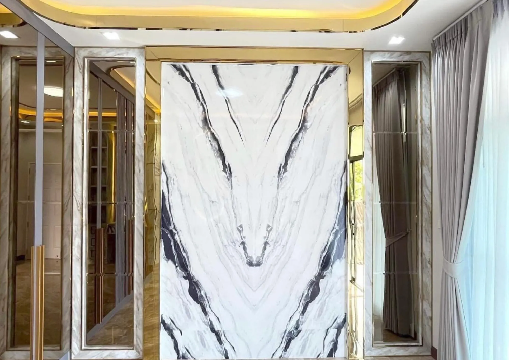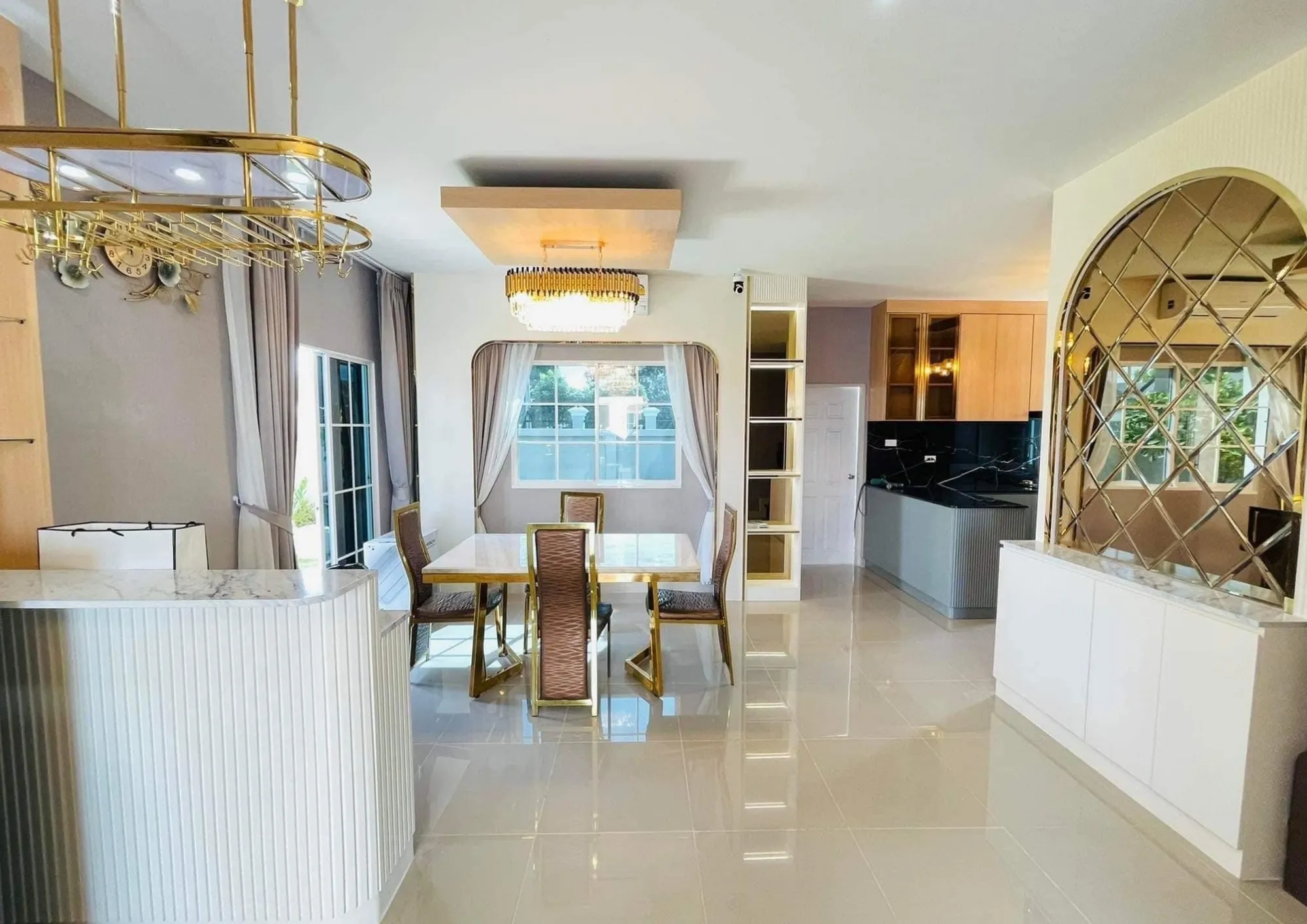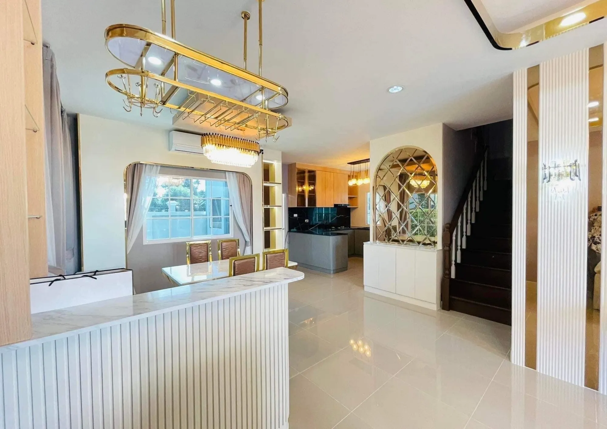 • เฟอร์นิเจอร์บิวอินขอบทองที่รับกับพื้นกระเบื้องแกรนิตโต้ผิวมัน